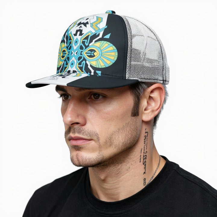 All-Over Print Black Buckle Flat-brimmed Mesh Cap With Box