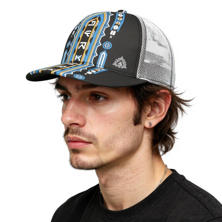 All-Over Print Black Buckle Flat-brimmed Mesh Cap With Box