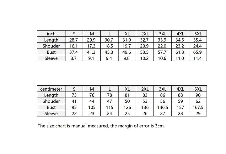 inch | S | M | L | XL | 2XL | 3XL | 4XL | 5XL |
