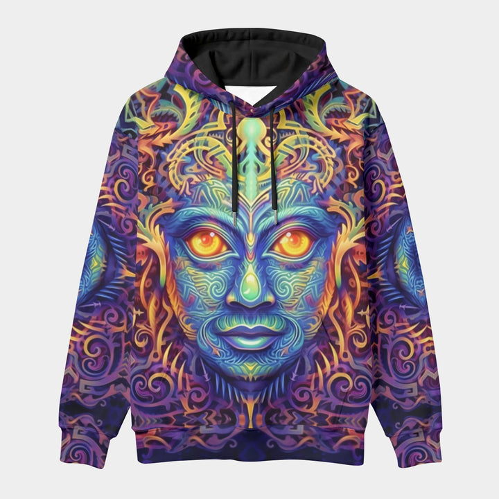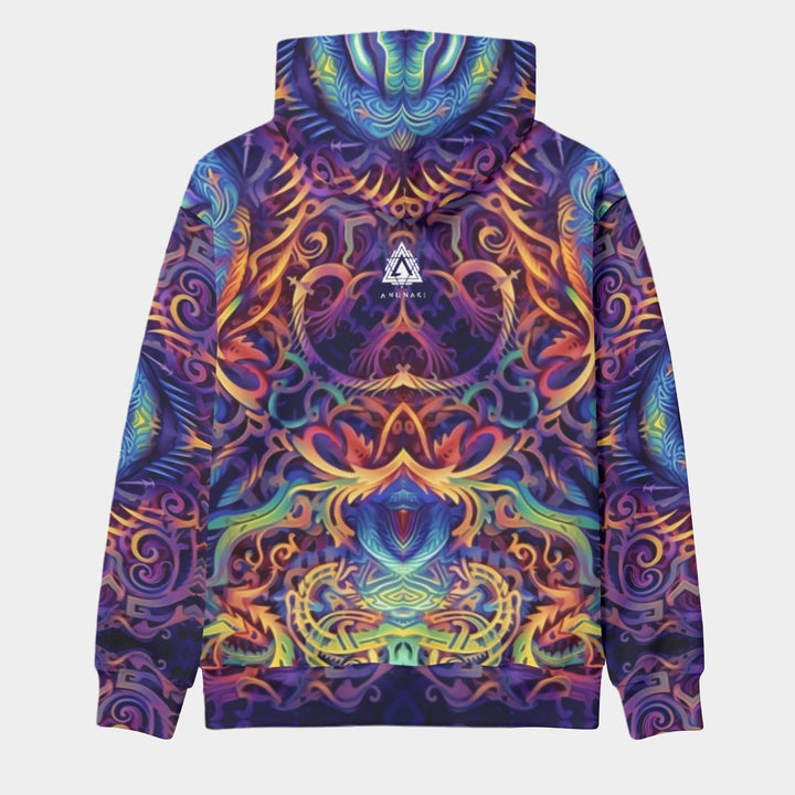 This hoodie is a striking piece of alternative fashion, embodying the themes of shamanism, post-apocalyptic fantasy, abstract art, and psychedelic aesthetics that Anunaki is known for