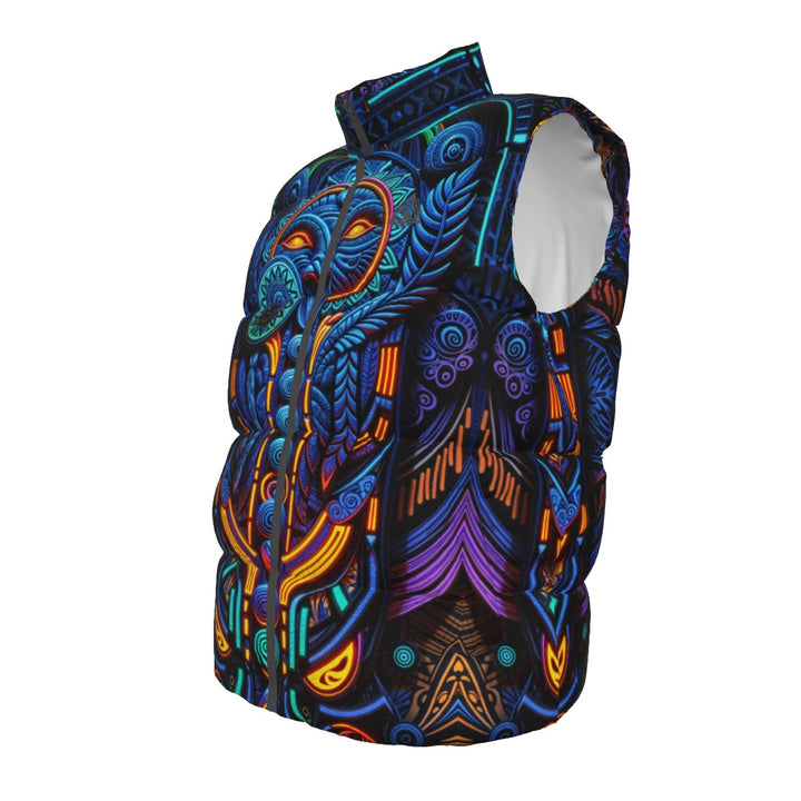 The 'All-Over Print Unisex Down Vest' unfolds as a captivating landscape of sapphire, amethyst, and ember hues. Its intricate pattern evokes the scaled majesty of a celestial serpent, winding through a galaxy of geometric precision. The design blends seamlessly, creating a hypnotic, almost bioluminescent effect. Experience unparalleled visual depth and dynamic comfort with this remarkable vest. The featherlight down filling offers a sumptuous embrace, while the vibrant print ignites the imagination.