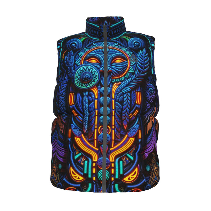 This vest embodies the convergence of ancestral artistry and digital innovation. It speaks to a lineage of shamans and visionaries who sought to decipher the patterns woven into the fabric of reality. The serpentine motif symbolizes transformation, wisdom, and the cyclical nature of time.