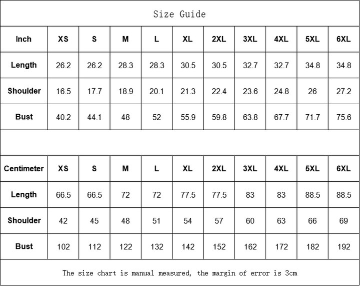 XS, S, M, L, XL, 2XL, 3XL, 4XL, 5XL, 6XL |